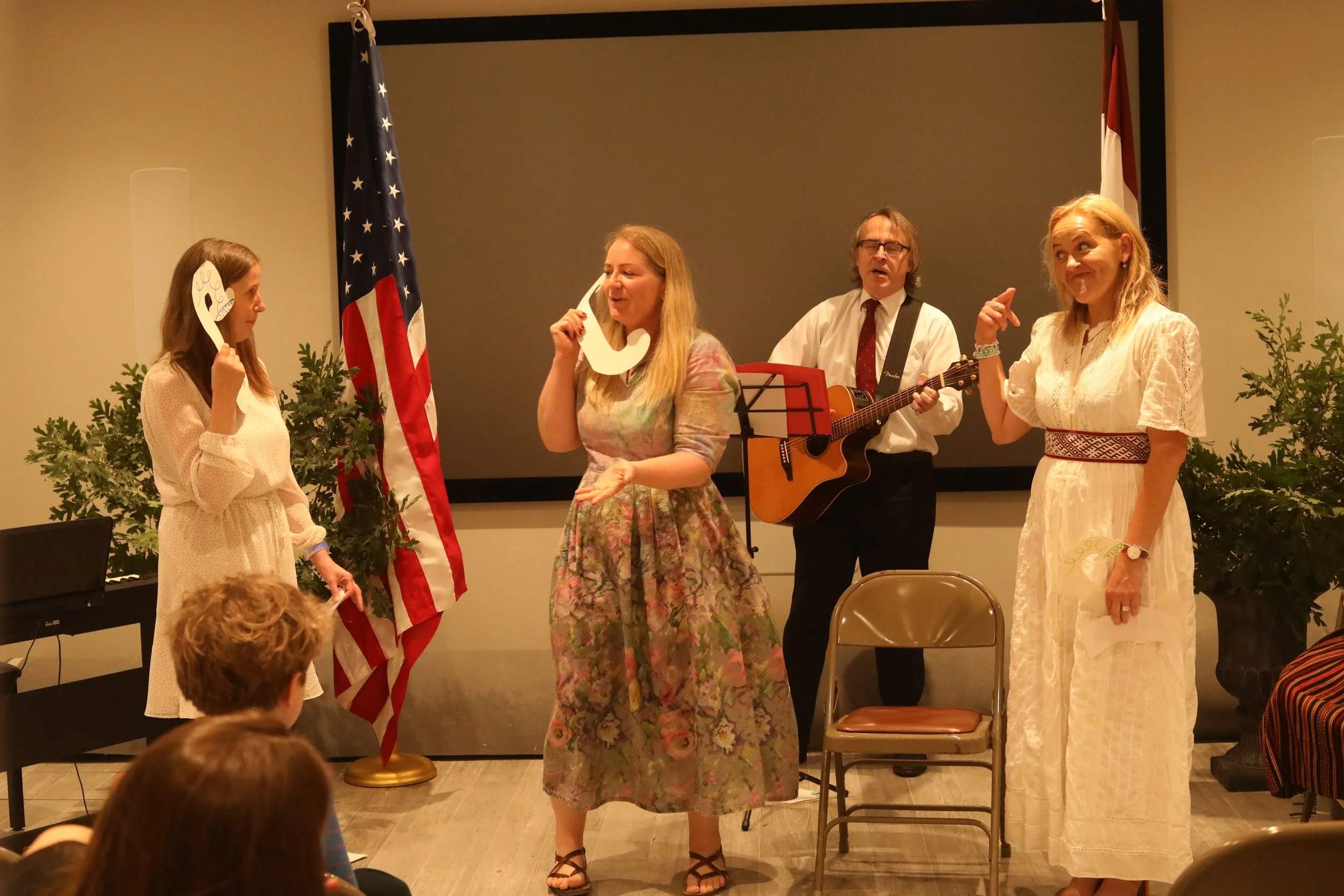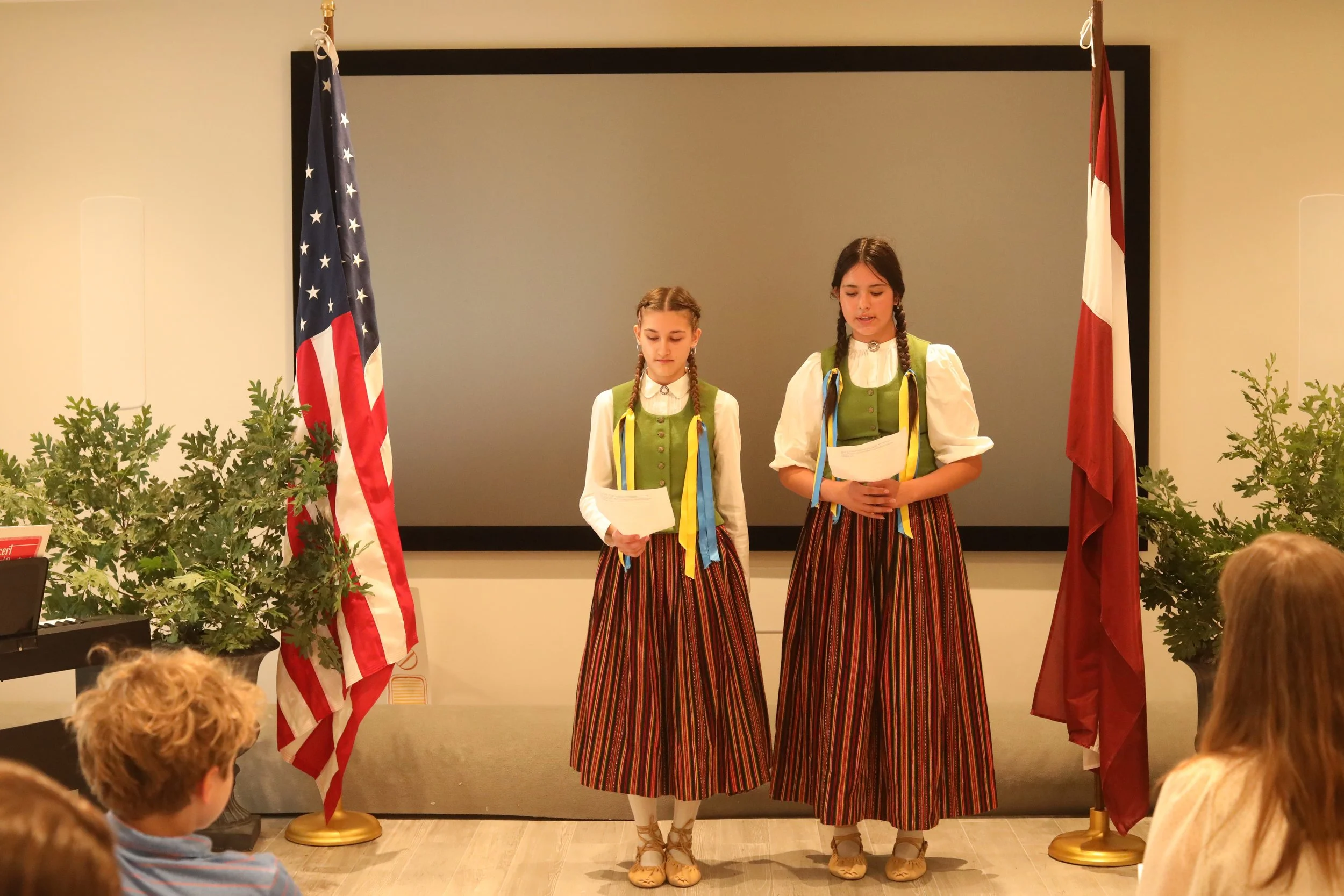 Lepojamies ar mūsu skolēnu skanīgo kopkori, ar mūsu stalto svētku pieteicēju Hudson Garbarino, mūsu daiļajām koklētājām Metti Eskildsen un Ellu Meilands, mūsu lokanajiem dejotājiem un mūsu brašo karognesēju Milo Juarez-Lacis 2024.gada valsts svētku svinību dienā!